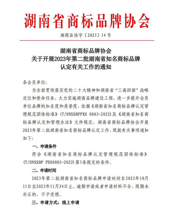 湖南省商标品牌协会关于开展2023年第二批湖南省知名商标品牌认定有关工作的通知